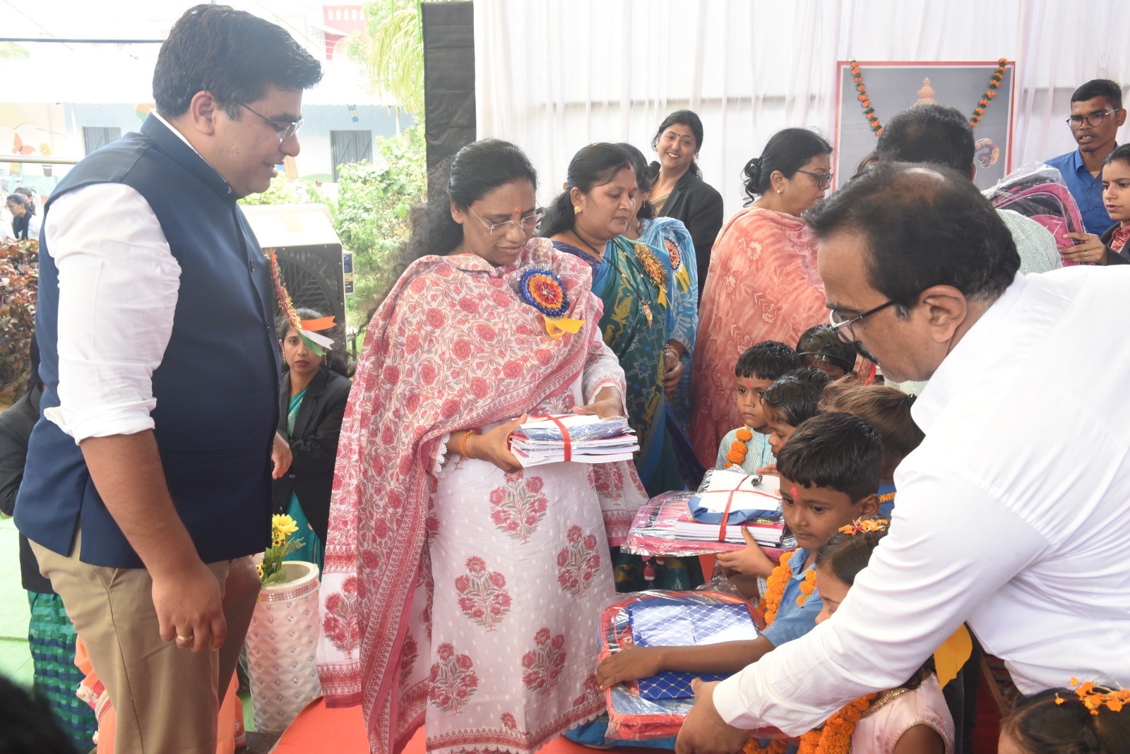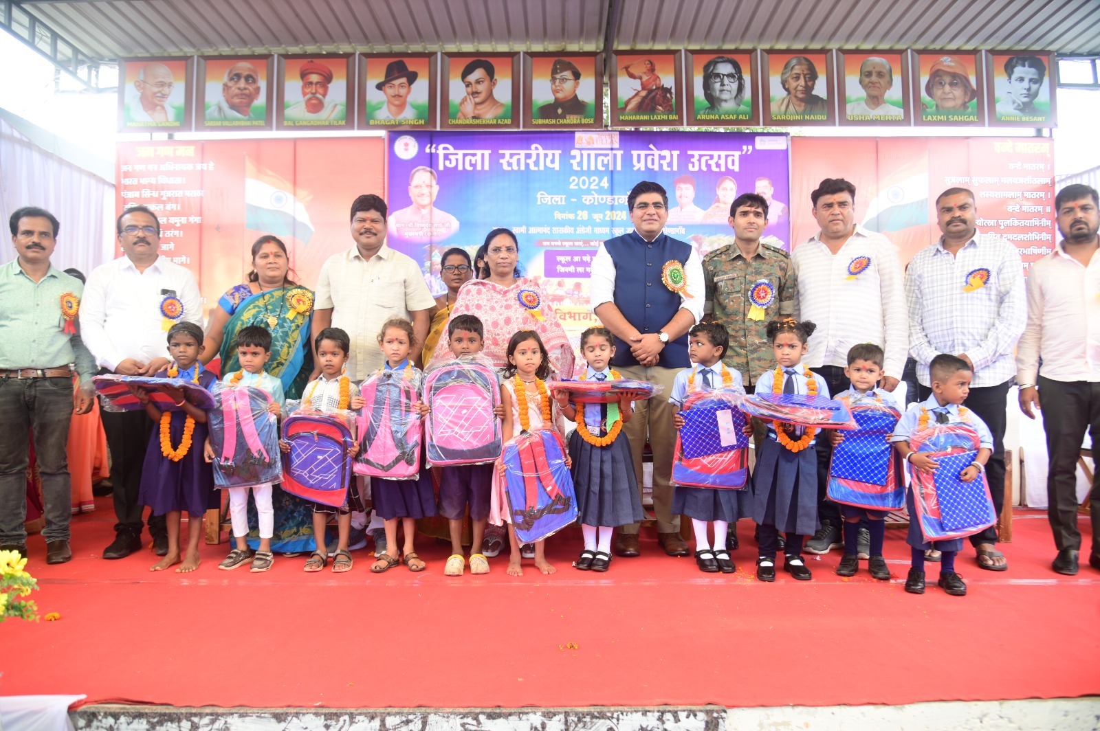 *कोण्डागांव,* कोंडागांव जिले के सभी 1983 विद्यालयों में बुधवार को हर्षाेल्लास से शाला प्रवेशोत्सव का आयोजन किया गया। जिला स्तरीय कार्यक्रम का आयोजन कोंडागांव जिला मुख्यालय के जामकोटपारा स्थित स्वामी आत्मानंद उत्कृष्ट अंग्रेजी माध्यम स्कूल में किया गया। यहां विधायक सुश्री लता उसेंडी, कलेक्टर श्री कुणाल दुदावत सहित जनप्रतिनिधियों ने नव प्रवेशी बच्चों का स्वागत तिलक लगाकर और फूलमाला पहनाकर किया। इसके साथ ही नवप्रेवशी बच्चों को पाठ्य पुस्तक, शाला गणवेश, स्कूली बस्ता और सायकल का वितरण भी किया गया।