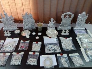 सायबर सेल व थाना माकडी के टीम द्वारा चोरी के आरेापी को दीगर राज्य ओडिषा , आंध्रप्रदेष, एवं राज्य के अन्य जिलों में लगातार पता तलाष की जा रही थी इसी दौरान पुलिस को मुखबिर से सूचना मिली कि चोरी का आरोपी सुर्दषन प्रधान पिता स्व. रत्नाकर प्रधान जाति पोतरिया प्रधान उम्र 45 वर्ष ग्राम दसमनिया ग्राम पंचायत मनतिरा थाना मोईथान जिला जाजपुर उडिसा ने अपने साथी को जेल से छुडाने व सामान खपाने के लिए जयपुर की ओर आने की सूचना पर रेड कार्यवाही कर आरोपी के कब्जे से 02 किलो चांदी, 400 ग्राम चांदी के बर्तन, 02 नग छोटी मुर्ति, 05 नग चादी नुमा बडी मुर्तियॉ , 01 नग मोटर सायकल कुल जुमला साढे चार लाख रूपये बरामद किया गया।