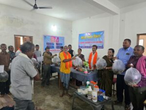“कोंडागांव में झींगा पालन प्रशिक्षण के दौरान कृषकों को मछली बीज वितरण करते अधिकारी”